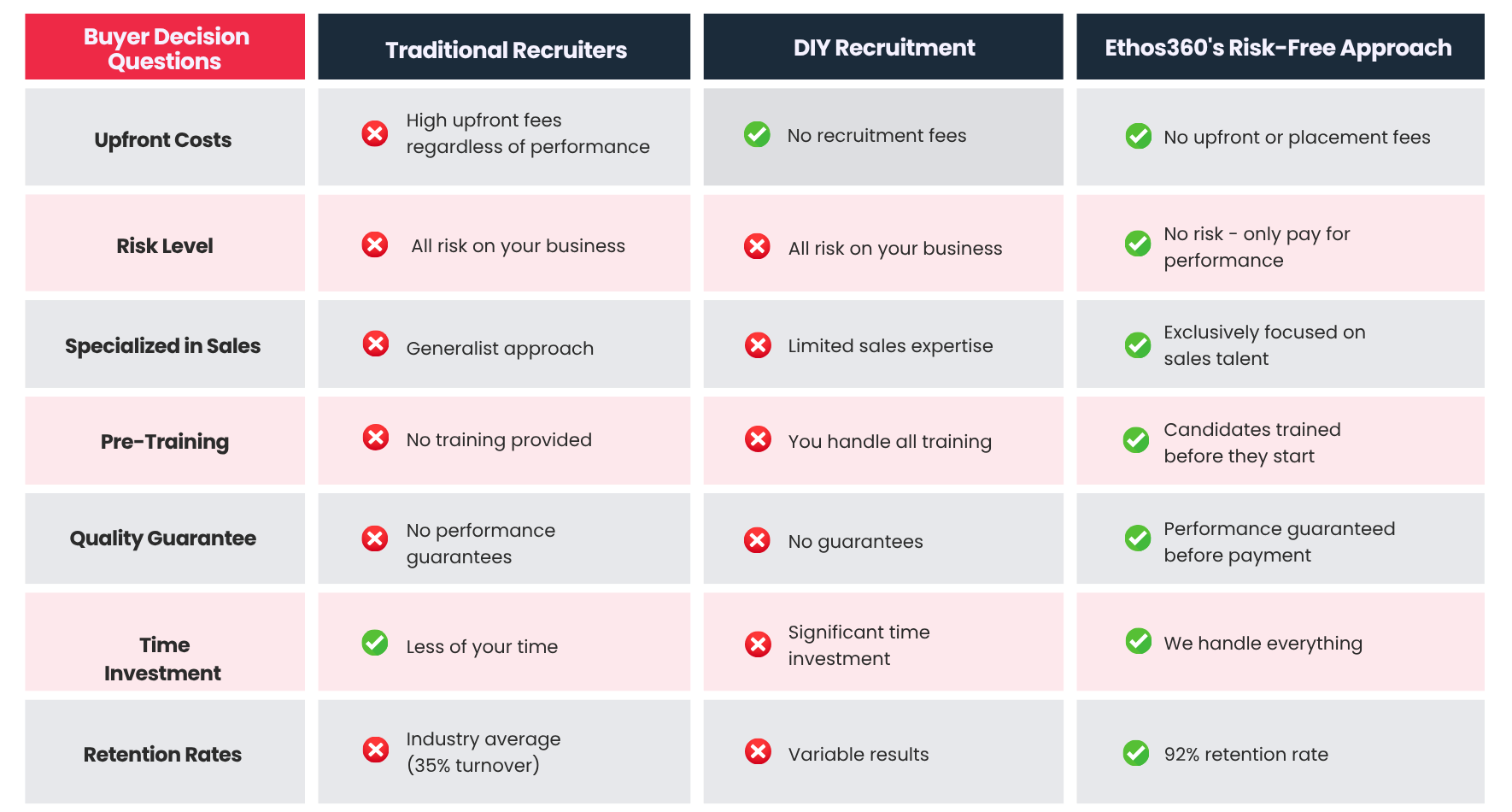 That’s why Nathan built Ethos360 Sales on a simple but rare promise: you only pay when your new sales hire delivers results.